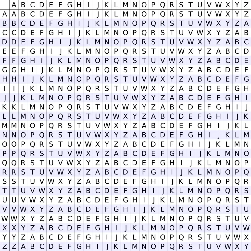 Dette er en tabell over hvordan Vigenére bestemmer enkrypteringen sin. Det forteller deg sikkert ingenting, men her er det litt kort forklart: